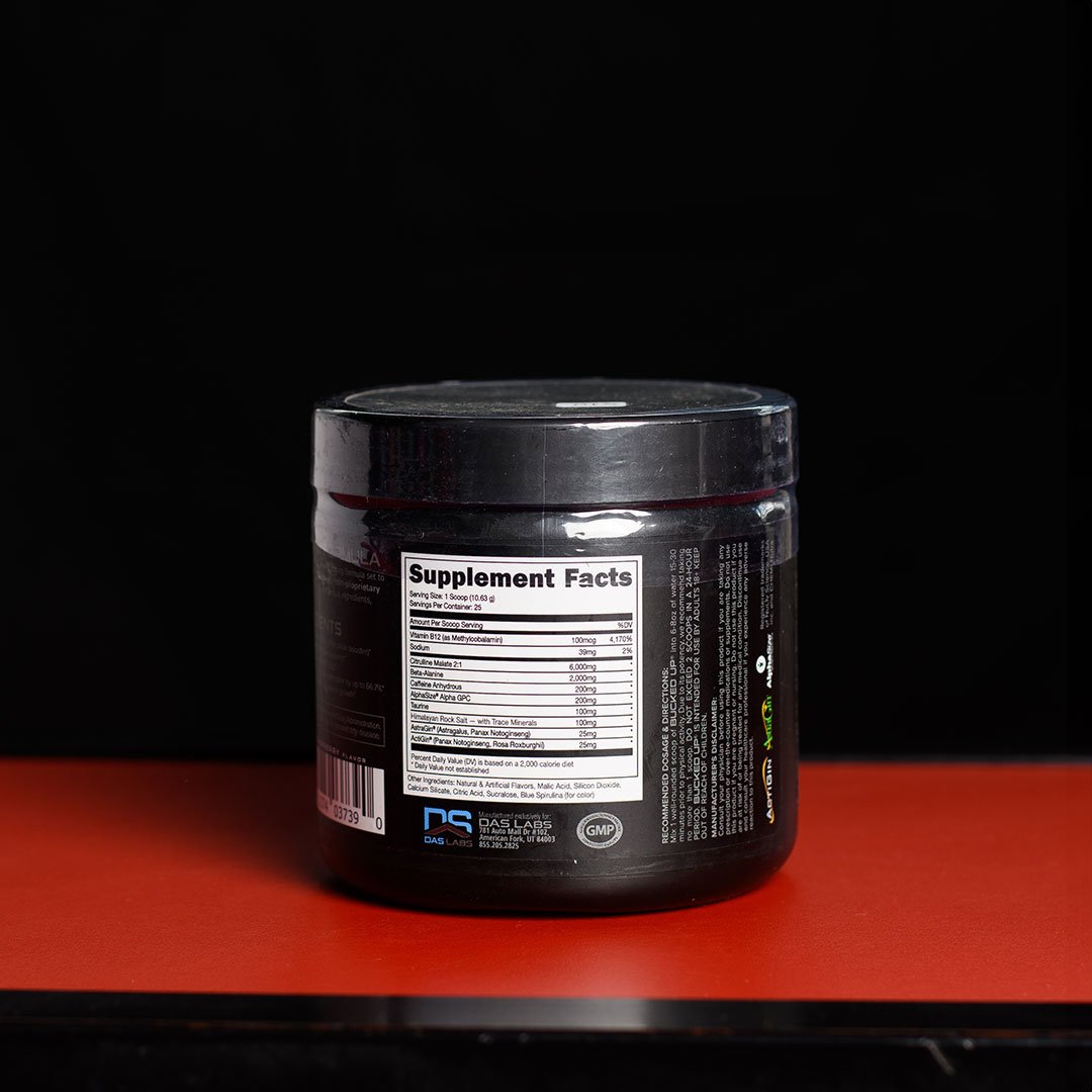 BUCKED UP (por DAS Labs) es un pre-entrenamiento de fórmula transparente (sin mezclas patentadas) diseñado para brindar energía poderosa, resistencia prolongada, bombeo muscular notable, enfoque nítido y rendimiento superior. Esta versión en polvo sabor Blue Raz, con 25 porciones, también es sin creatina, sin azúcar, compatible con dieta keto/paleo y certificada GMP.