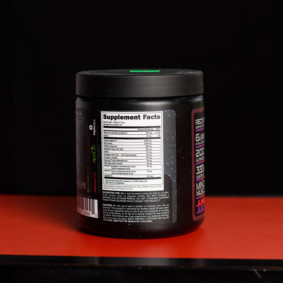Ingredientes claveCitrulina 6 g, Beta-alanina 3.2 g, Cafeína 333 mg, Alpha-GPC 200 mg, Hordenine 40 mg, Huperzina A 50 µg, ActiGin® 25 mg, AstraGin® 25 mg, Deer Antler Velvet 50 mg, Taurina 100 mg, B12 100 µg, Sal Rosa del Himalaya 100 mg