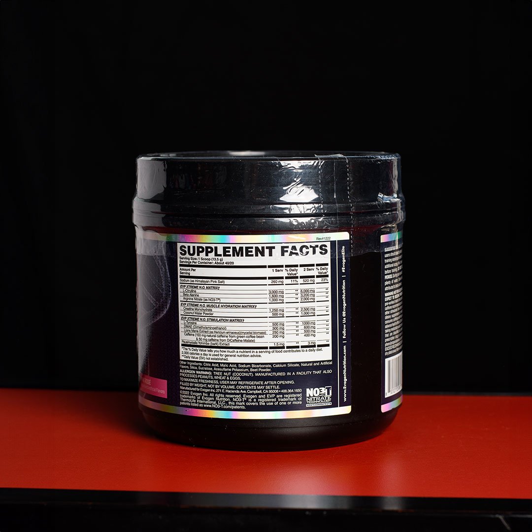 EVP Xtreme es un pre-entrenamiento de alta potencia, diseñado por Evogen Nutrition bajo la dirección del entrenador Hany Rambod. Está formulado para generar energía explosiva, enfoque mental intenso y bombas musculares extremas. La versión sabor Pink Rose, con 40 porciones, se centra en la vasodilatación, energía profunda y resistencia prolongada.