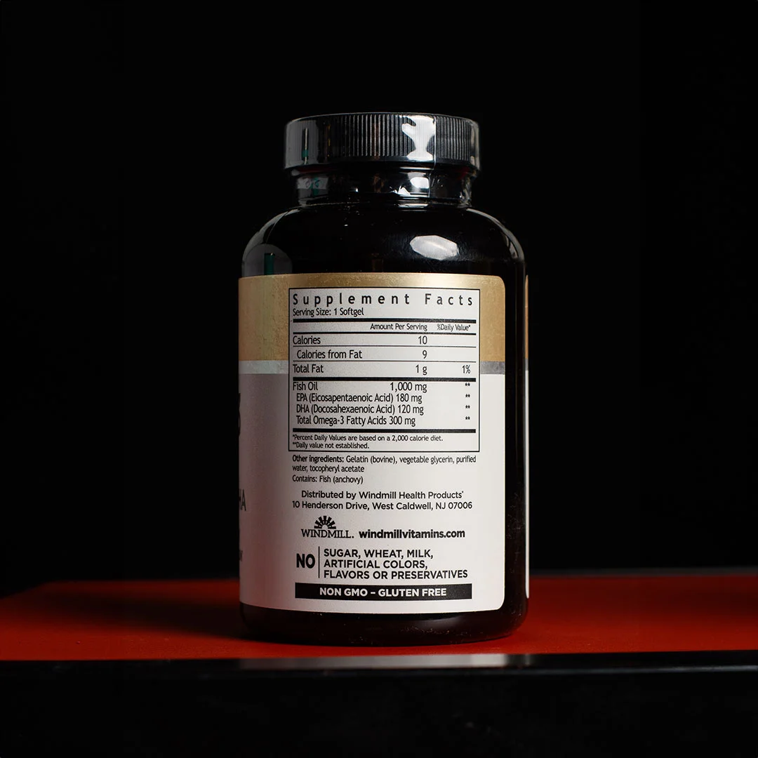Windmill Health Omega-3 EPA + DHA 1000 mg es un suplemento en cápsulas blandas que aporta ácidos grasos esenciales de aceite de pescado purificado. Está diseñado para respaldar la salud cardiovascular, cerebral y articular, con una fórmula de alta pureza y sin sabor. Cada envase incluye 90 cápsulas blandas de 1000 mg, ideales para consumo diario.